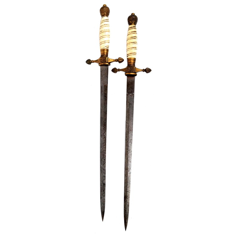 Two Imperial German naval dress daggers, etched blades 13.5 in., gilt brass cross guards and pommels, the latter with wheat ears in relief, barley twist ivory grips, lacking scabbard.[2]