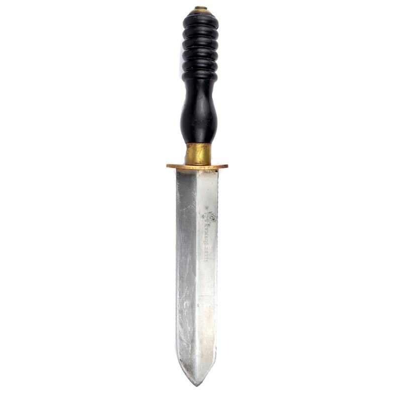 A Diver's knife, by Seibe Gorman, heavy double edged blade 7.5 in., brass guard and ferule, composition grip of ribbed baluster form, lacks scabbard.
