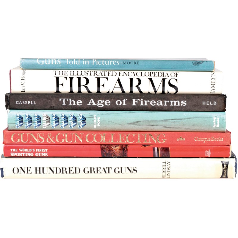 A small collection of books, including: Merrill Lindsay, 'One Hundred Great Guns, an illustrated history of firearms'; Howard L. Blackmore, 'The World's Finest Sporting Guns'; Warren Moore, 'Guns Told in Pictures'; and four other firearm related titles; together with a collection of 175 Wallis and Wallis catalogues, with results (printed and in annotations)
