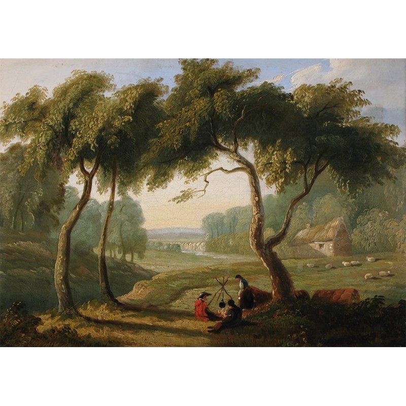 English School 19th Century Landscape with rustics by a fire Oil on canvas 27 x 40cm; 10 x 15in
