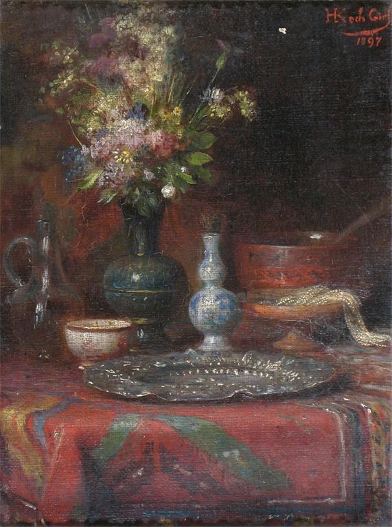 H. Koch Girl (Continental c. 1900) Still life of a vase of flowers and other items on a table ...