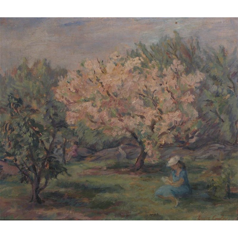Lydia Cooley (American 1906-1996) A girl reading in an orchard Signed Oil on board 29 x 35cm;...