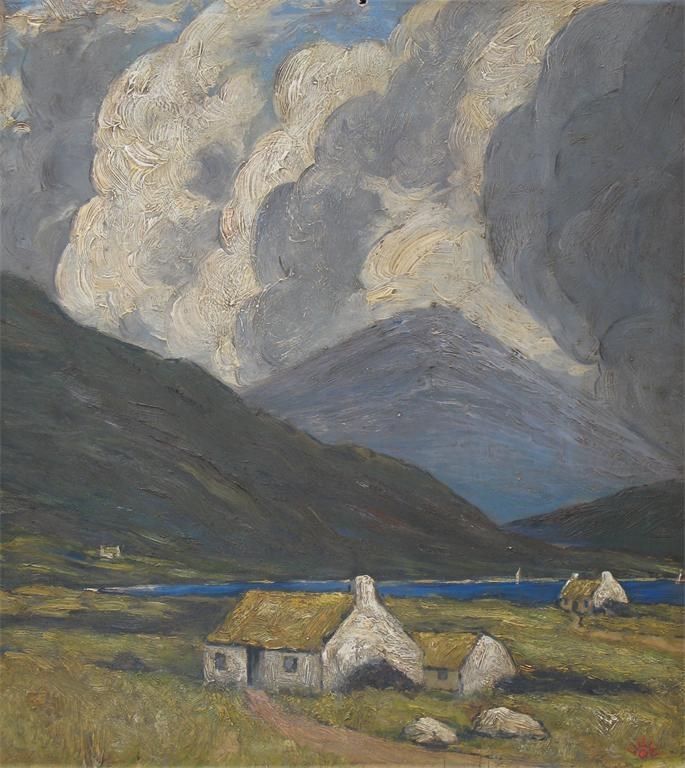 Follower of Paul Henry Irish mountain landscape with cottages Signed with a monogram Oil on...