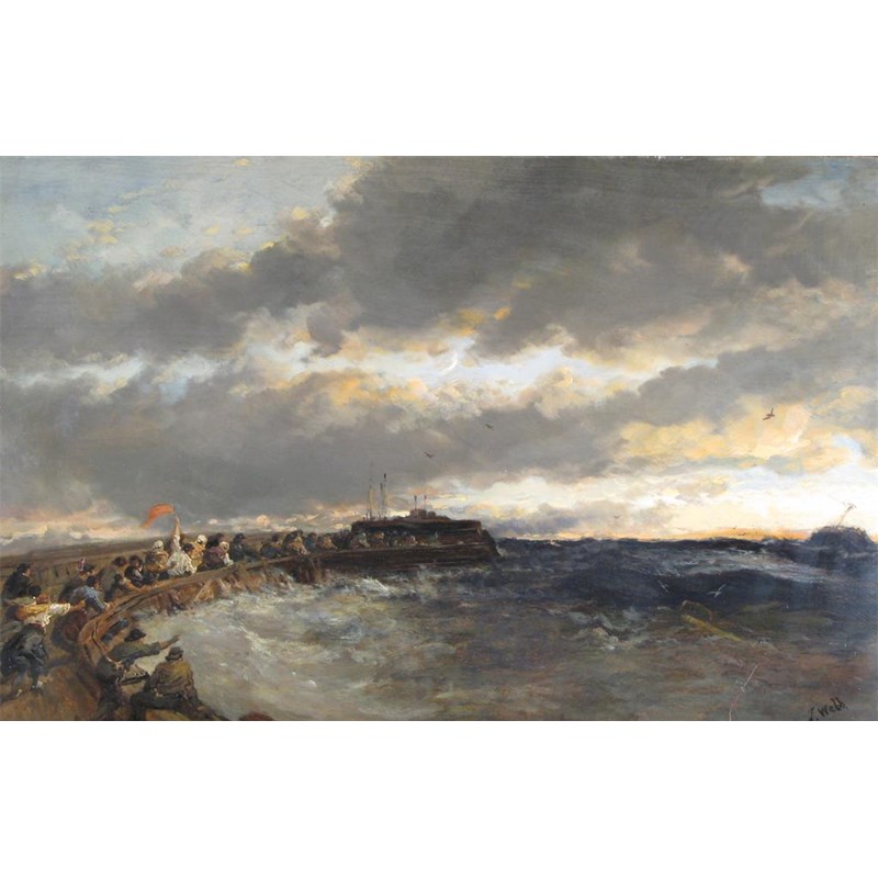 Follower of James Webb Stormy seascape with fisherfolk on a pier watching a ship in distress...