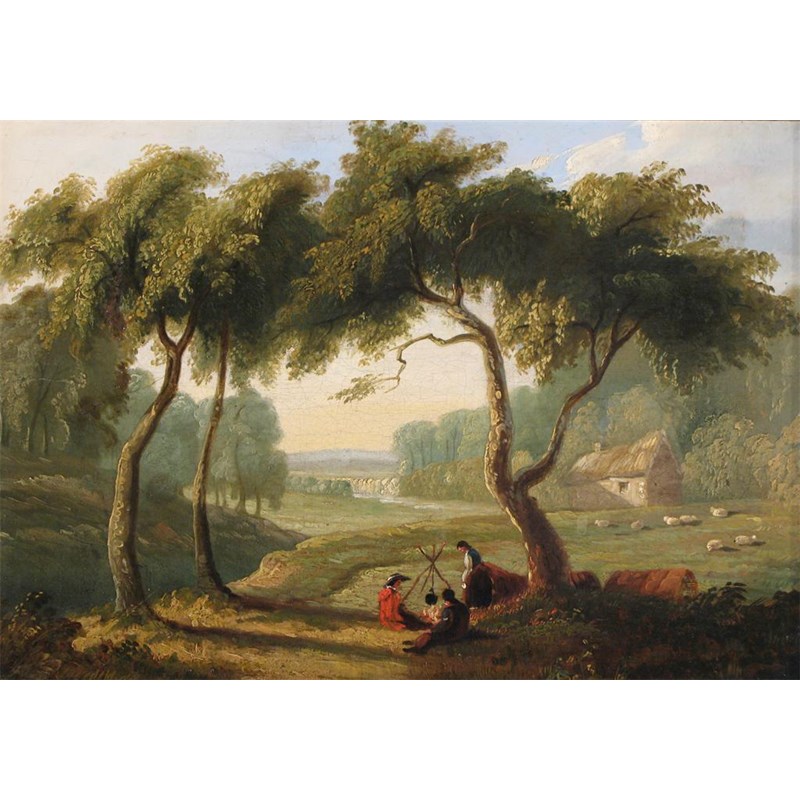 English School 19th Century Landscape with rustics by a fire Oil on canvas 27 x 40cm; 10½ x 15¾in