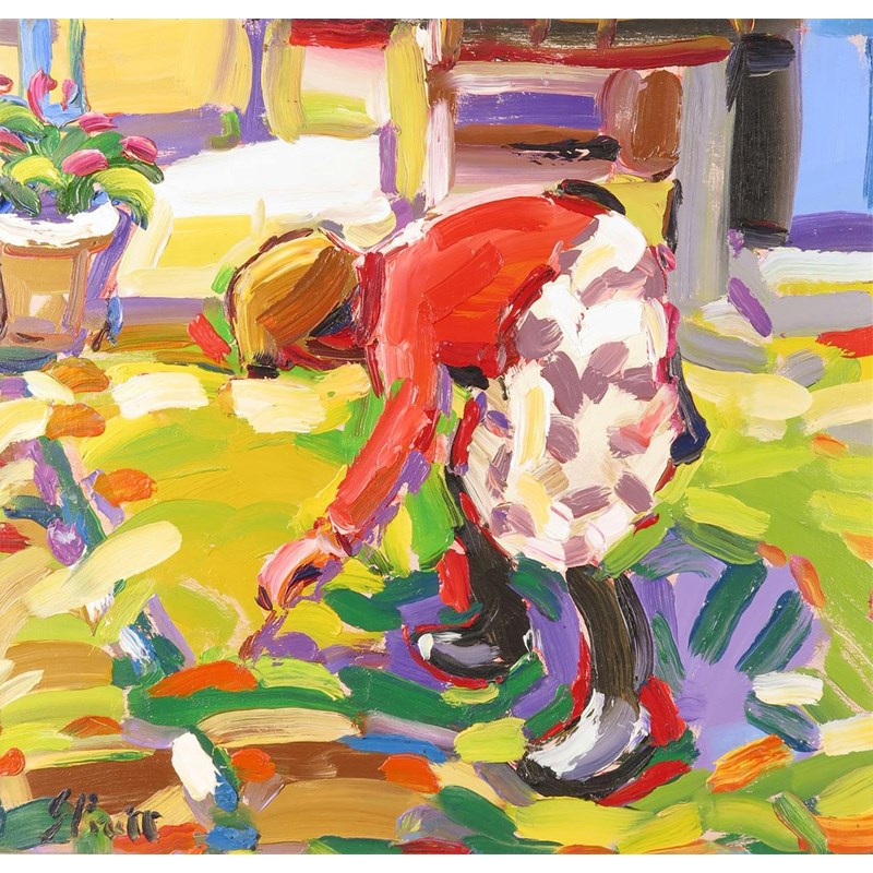 ‡Jeffrey Pratt (b.1940) Tending the garden Signed Oil on board 45.5 x 48cm