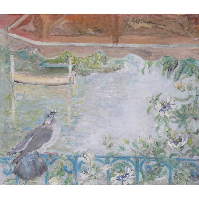 ‡Dorothy Williams (20th Century) Pigeon on a balcony with passion flowers Oil on board 50.5 x 58.5cm