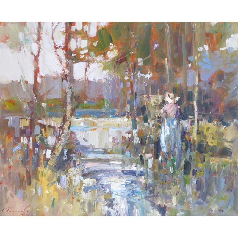 English School 20th Century A lady painting in a wooded glade Signed and dated indistinctly Oil...