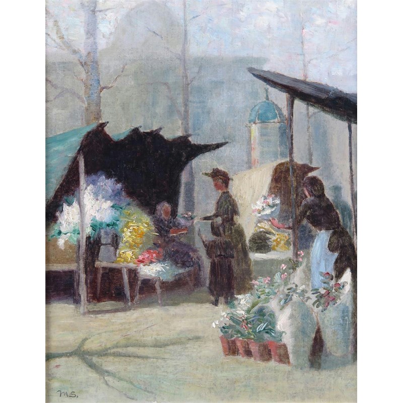 ‡Mark Senior (1864-1927) The flower market Signed with initials Oil on canvas laid on board 41 x...