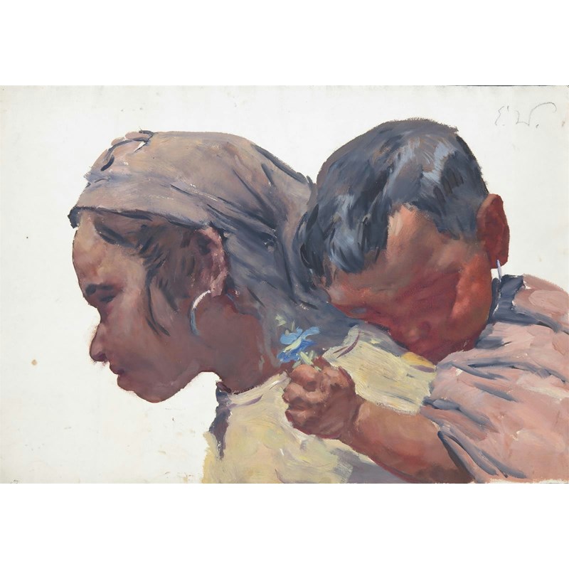 ‡Erich Wolfsfeld (1885-1956) A mother carrying her son on her back Signed with initials Oil on paper