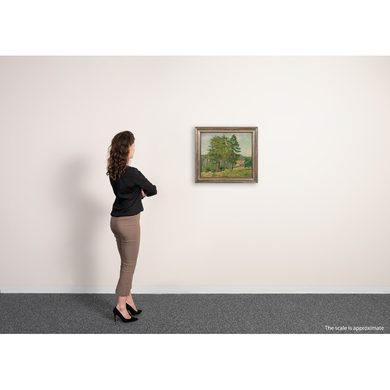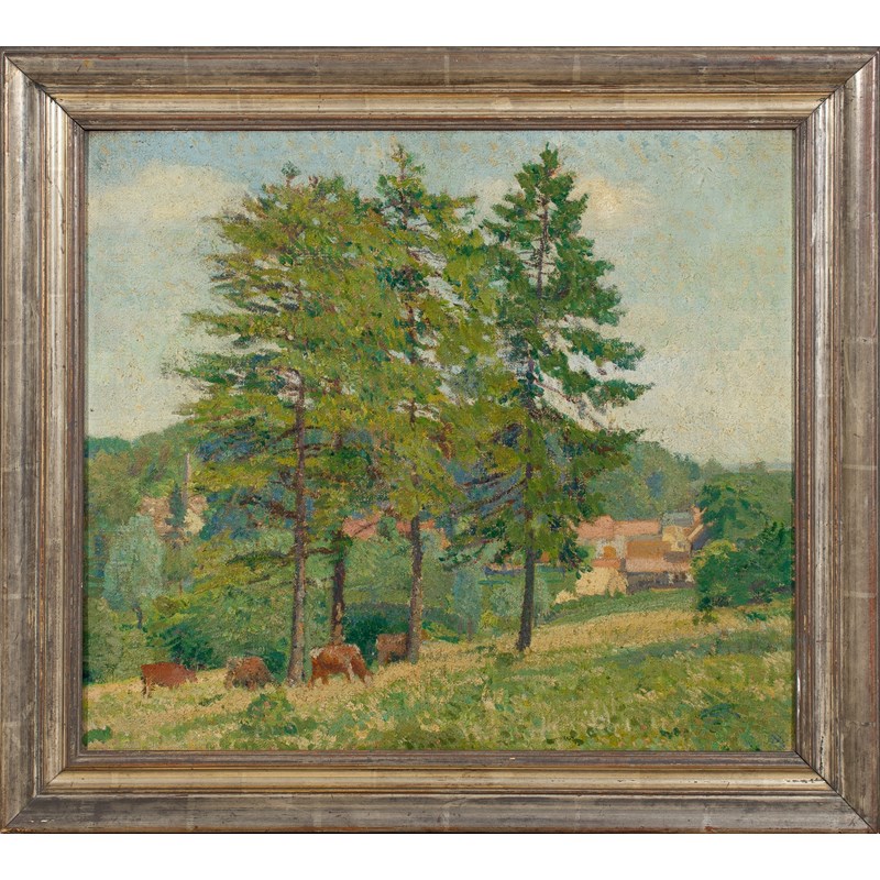 Landscape with cattle in a field and a village beyond