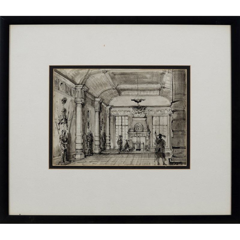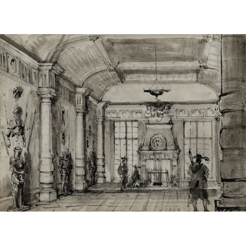 Stage design for a hall in the Château de Vallombreuse in Théophile Gautier's Le Capitaine Fracasse