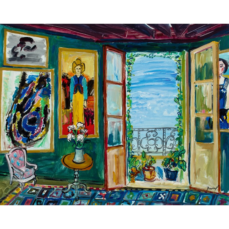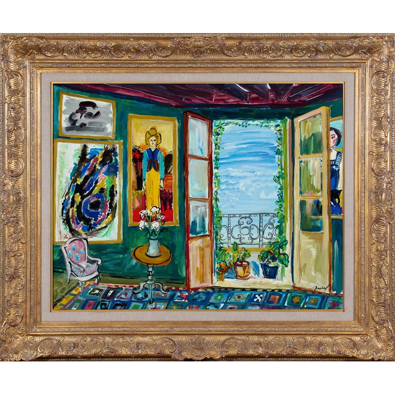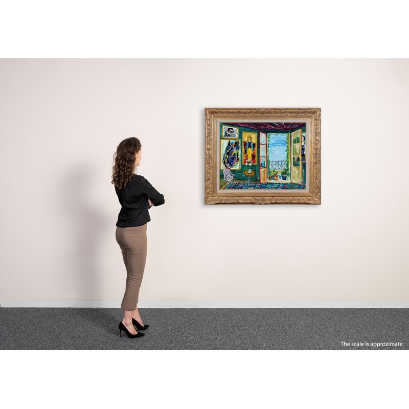 Through his vibrant palette and fluid, expressive line, Carlos Nadal transformed ordinary interiors into joyous, celebratory paintings and today is considered one of the most significant Spanish artists of the 20th Century. His work was heavily influenced by the Fauves, leading to the intense contrasts of colour that we see in Intérieur à la fenêtre ouvrant sur la mer Méditerranée. Nadal frequently made references to other artists in his work, and the motif of painting a scene beyond an open window, which we see in the present work, was a favourite of Matisse’s, who Nadal met in 1948. Nadal’s paintings are joyous and optimistic, reflecting his view that one should “look up and around, not down at the pavement – enjoy life”.