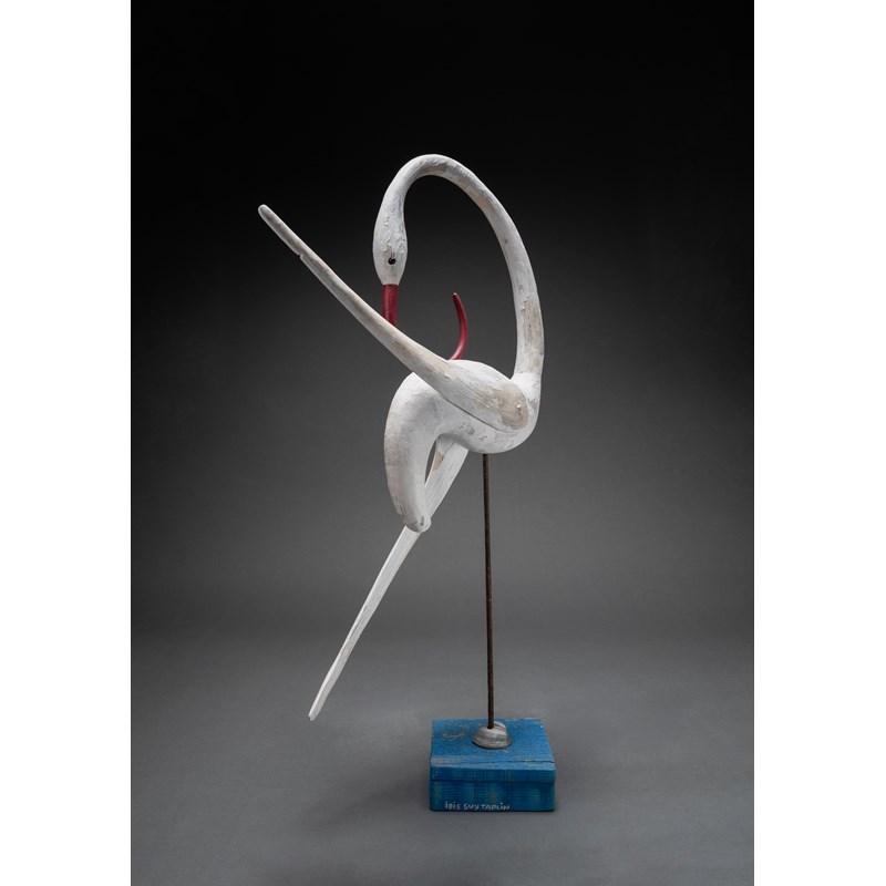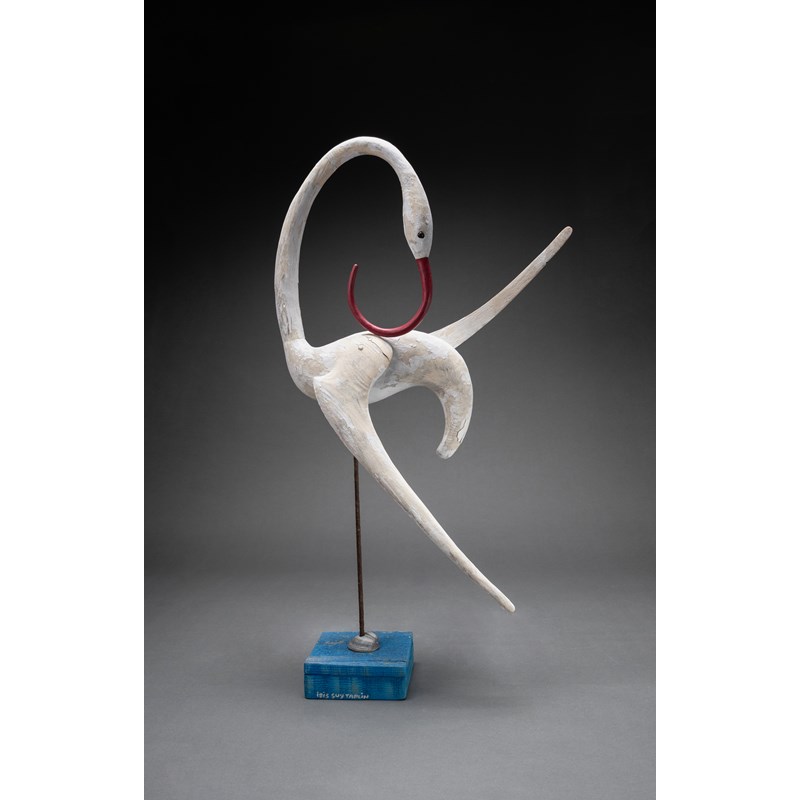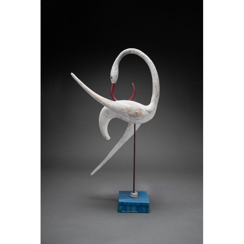 Painted wood with glass bead eyes on a painted driftwood base with metal and sea shell support