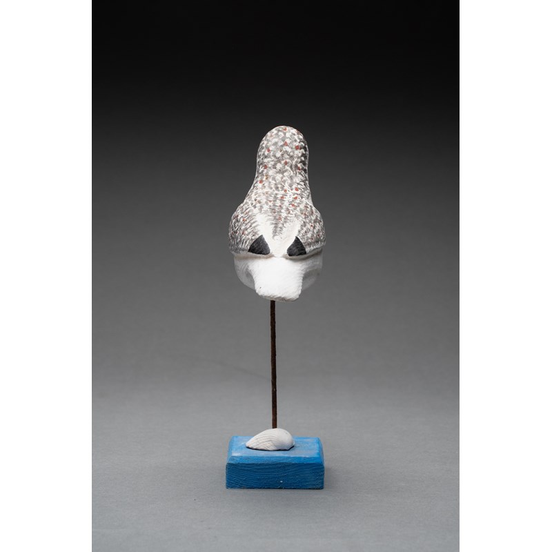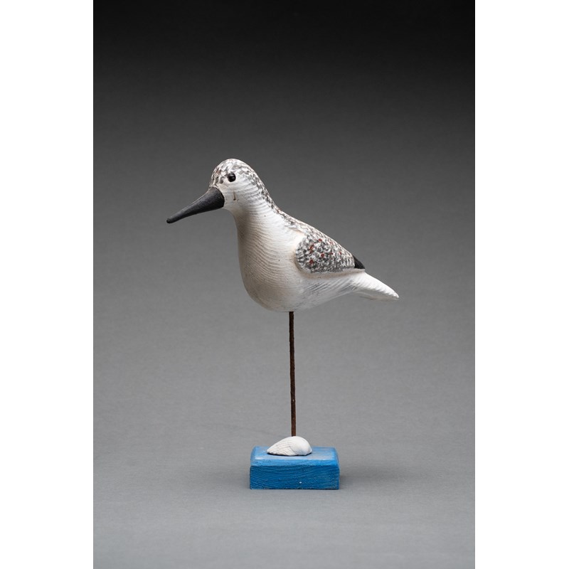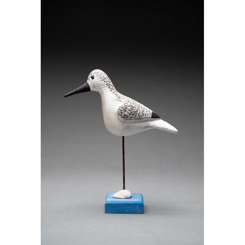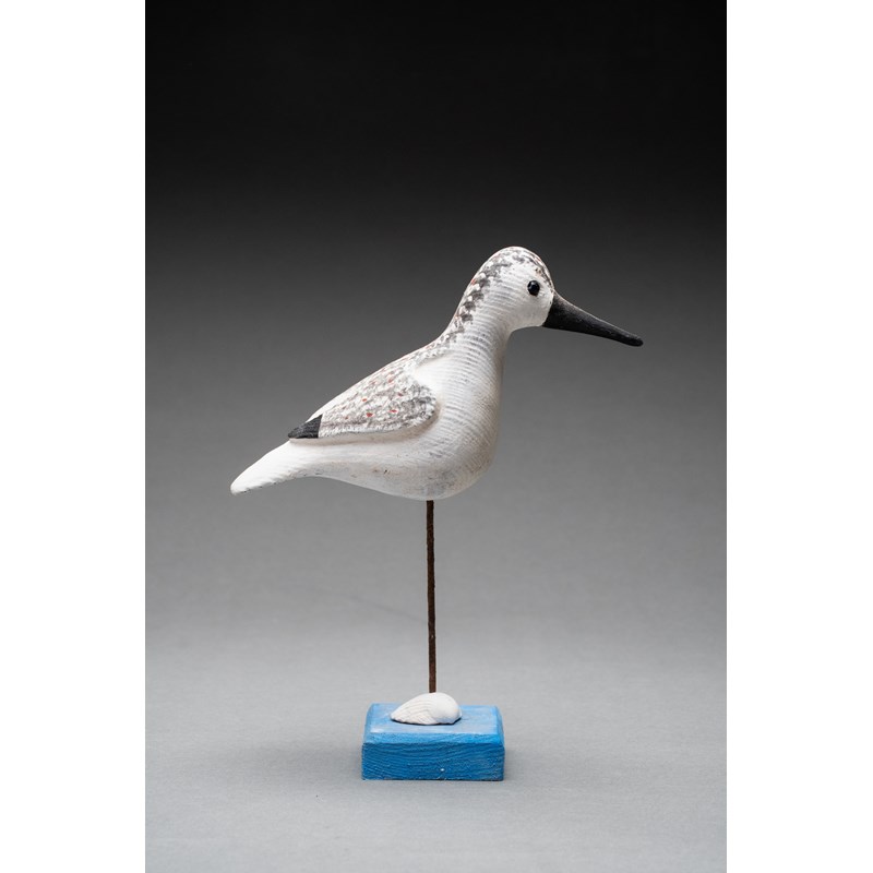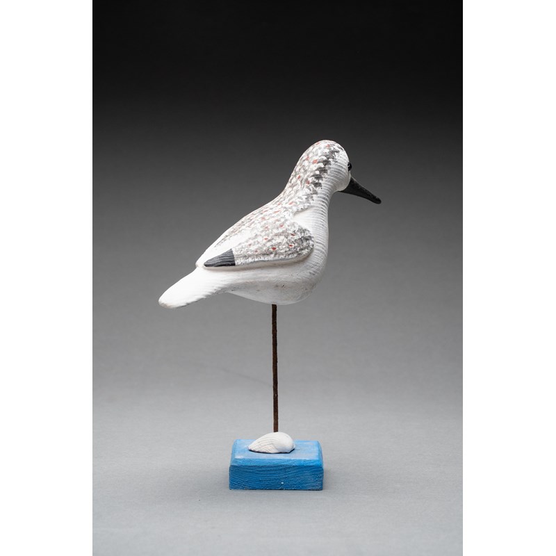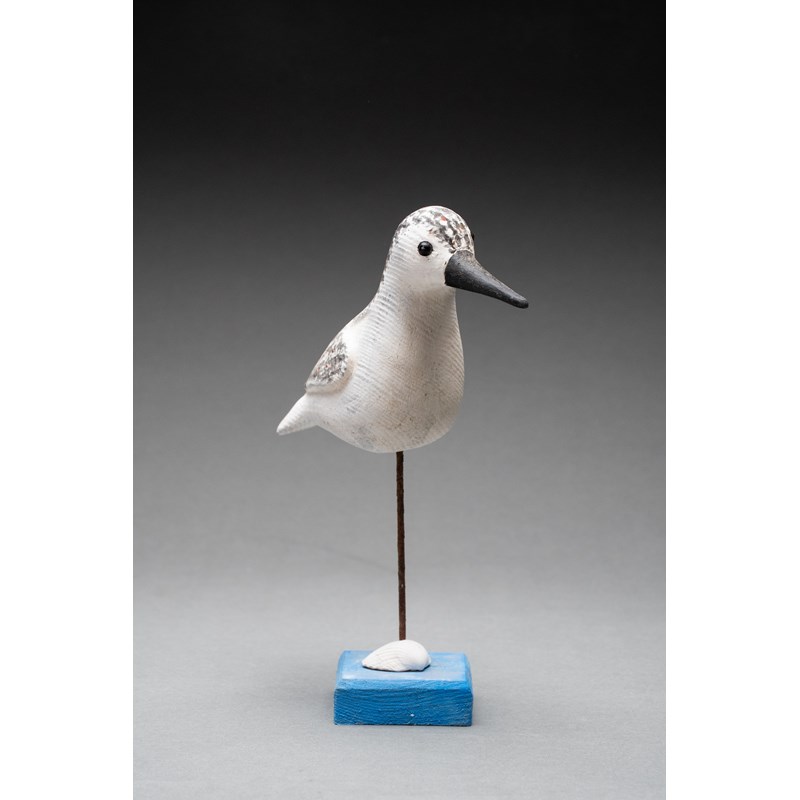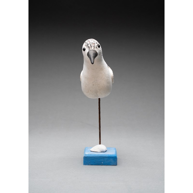 Painted wood with glass bead eyes on a painted driftwood base with metal and sea shell support