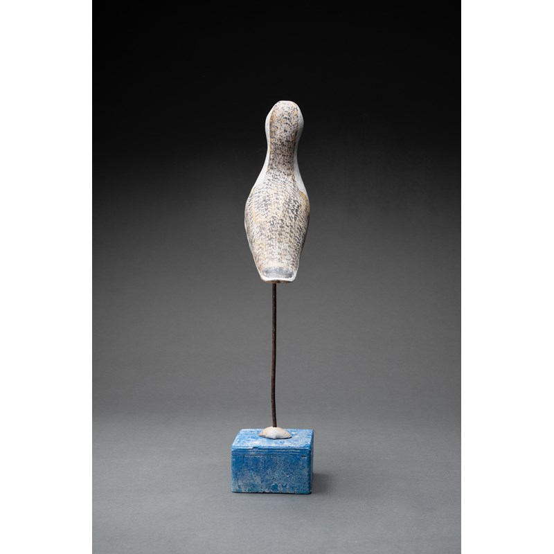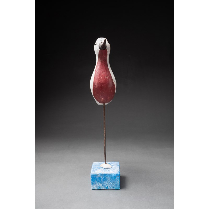 Painted wood with glass bead eyes on a painted driftwood base with metal and sea shell support
