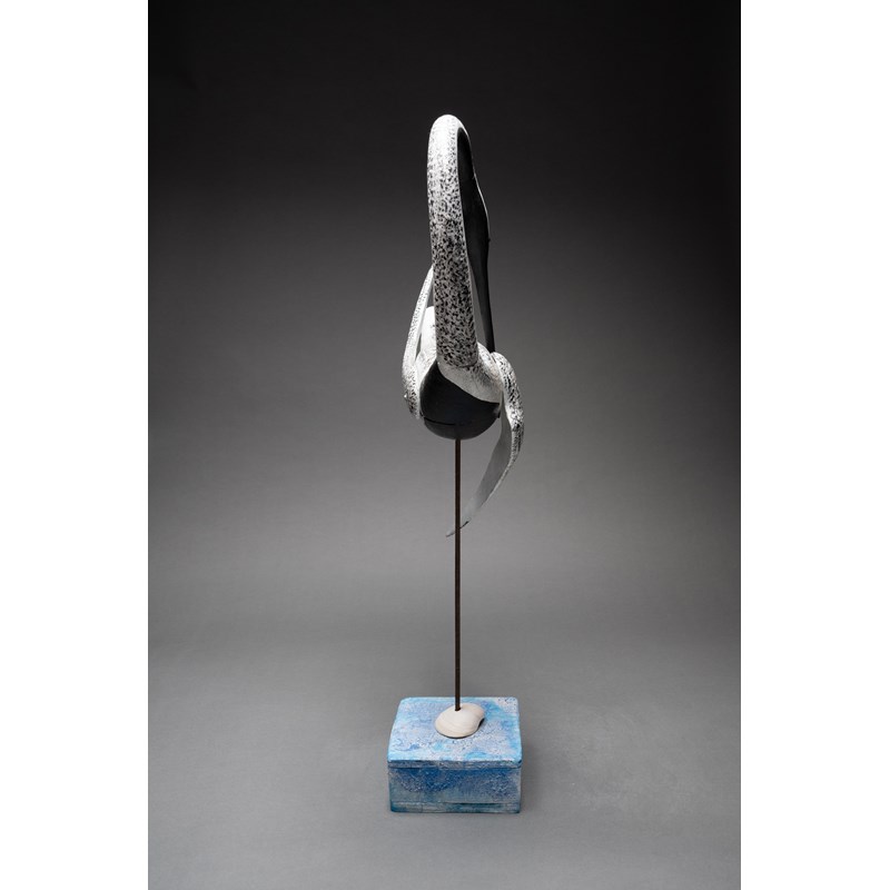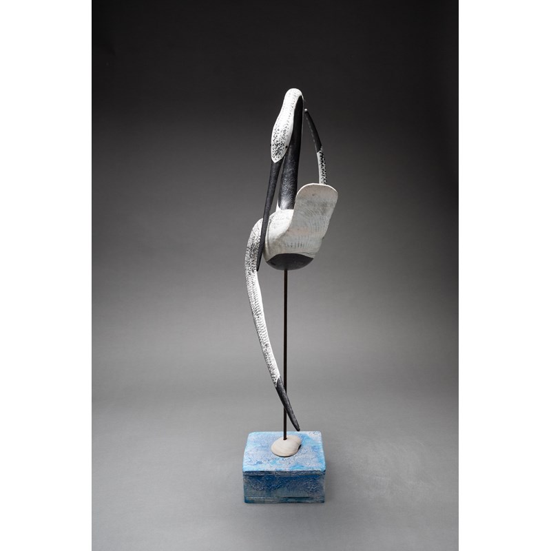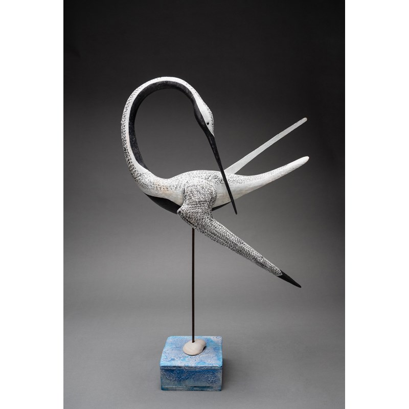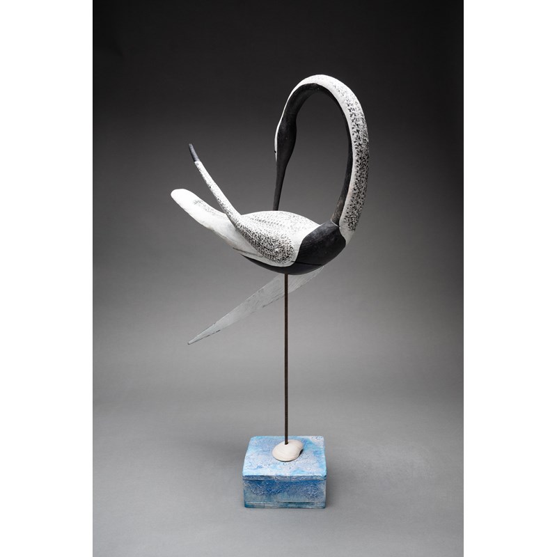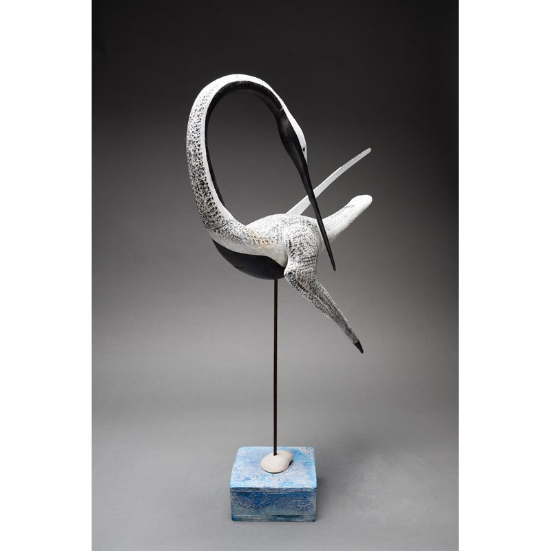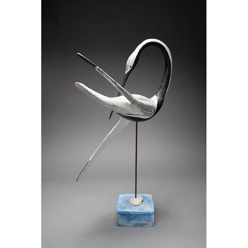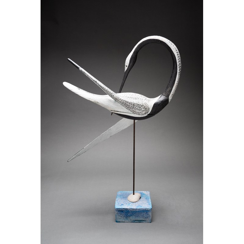 Painted wood with glass bead eyes on a painted driftwood base with metal and sea shell support