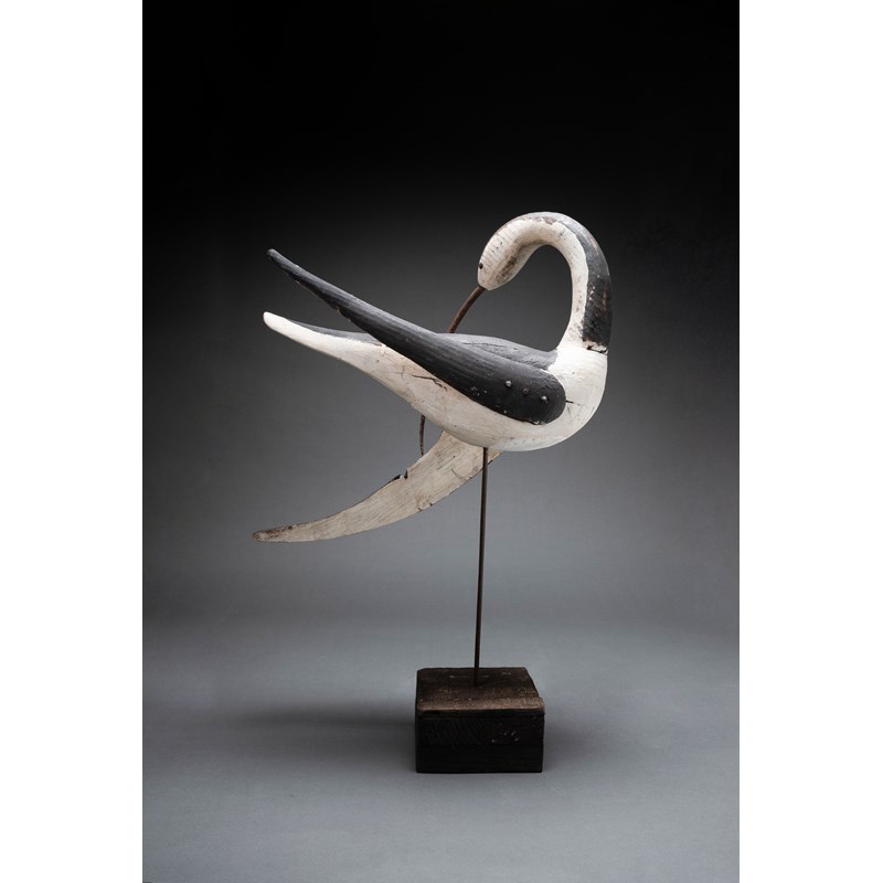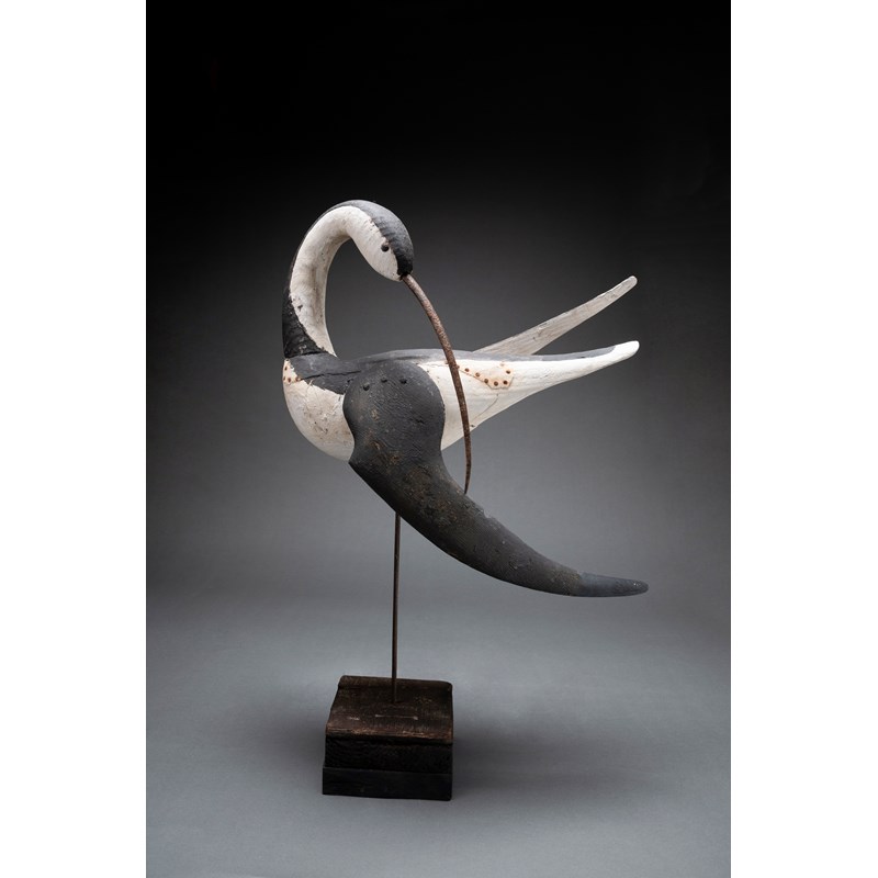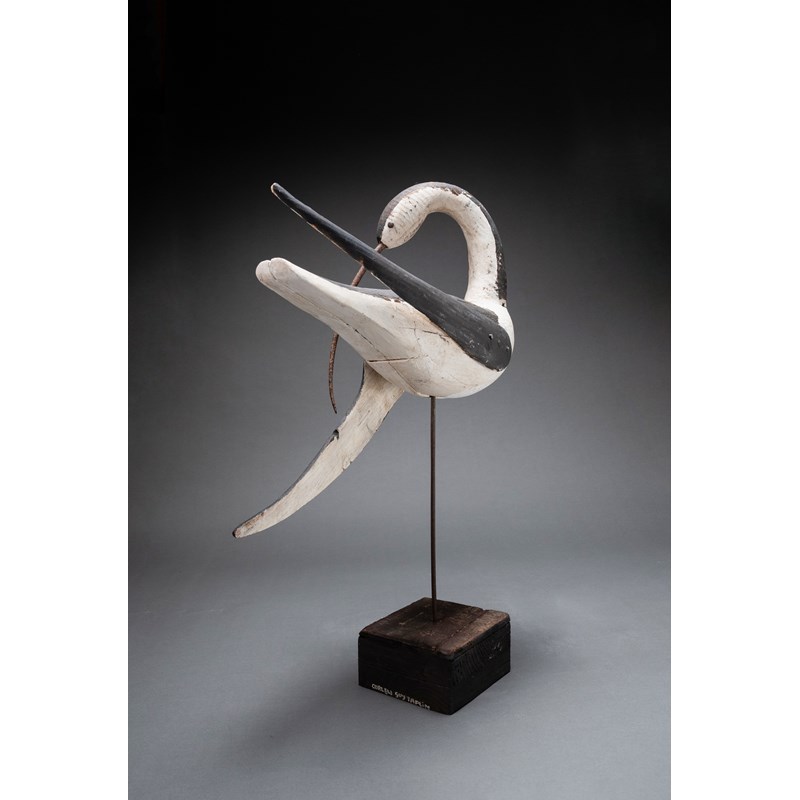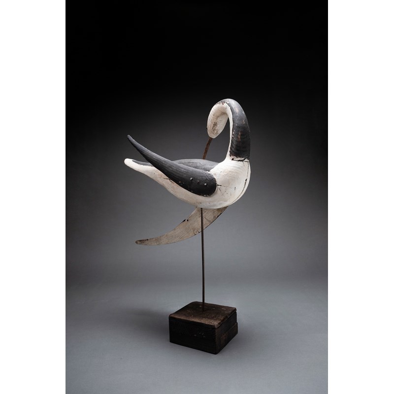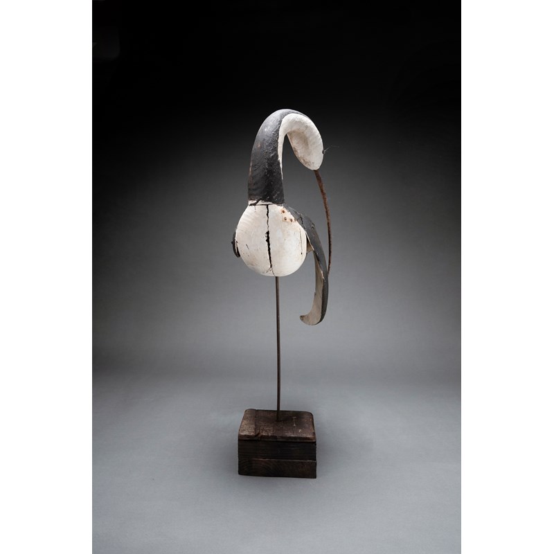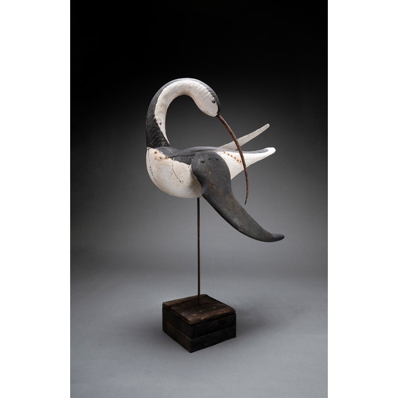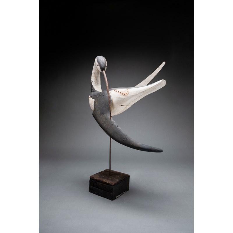 Painted wood with glass bead eyes and metal beak on a driftwood base with support