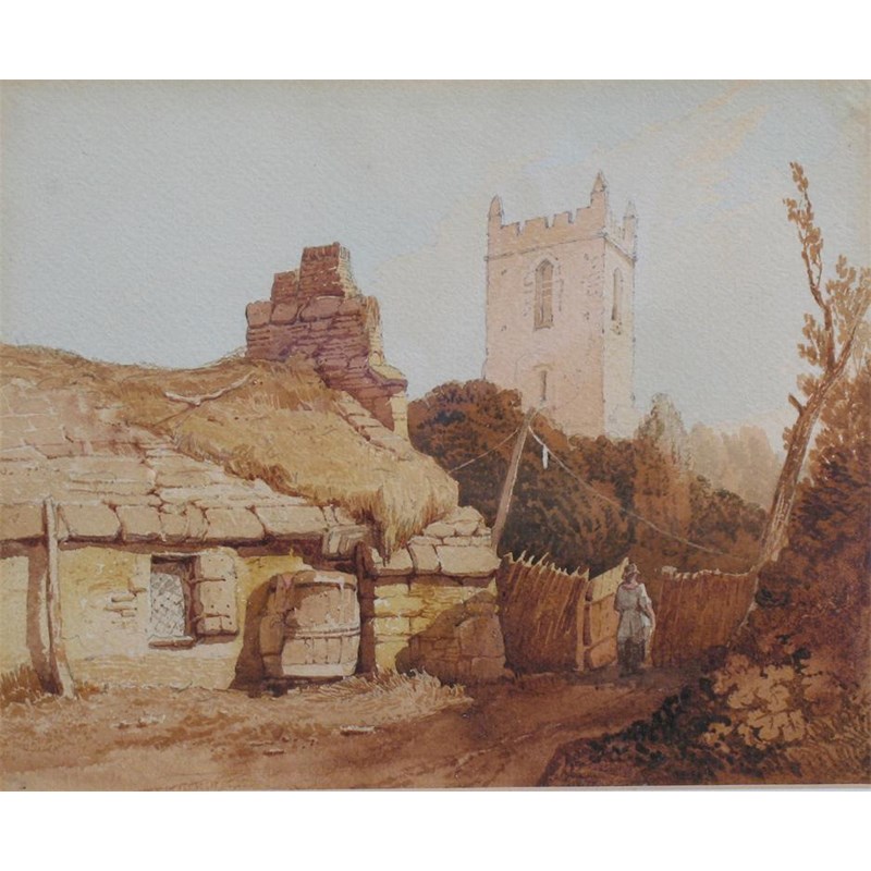 ATTRIBUTED TO SAMUEL PROUT (1785-1852): A figure by a thatched cottage, a church beyond, watercolour and pencil, 21 x 26cm (8.25 x 10.25in) ++ Slight fading in sky, otherwise good.