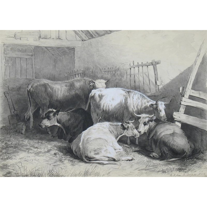 MARY PORTER (19th century): Four pen and ink sketches of cattle and sheep, after Thomas Sydney Cooper (4) Mary Porter attended Coopers 'drawing classes for ladies' at Canterbury ++ One with two tears to edge.