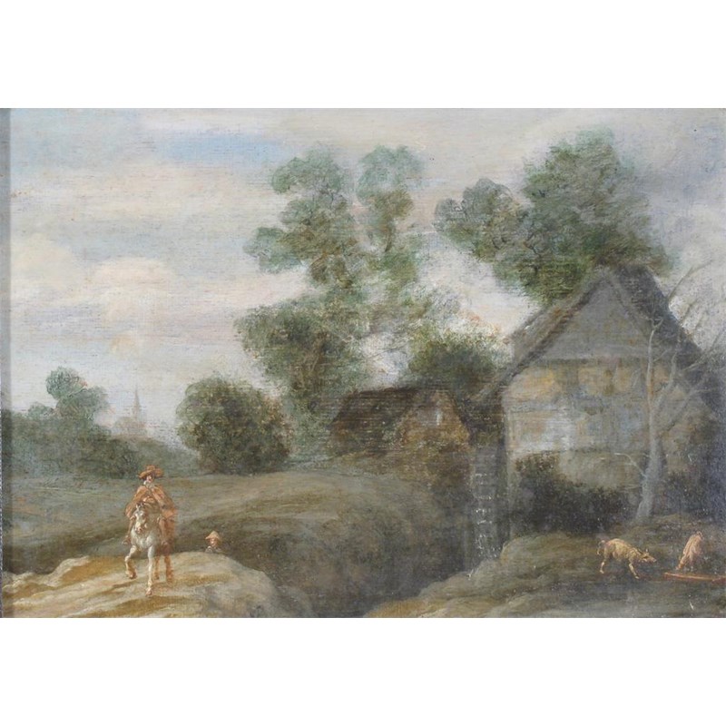 FOLLOWER OF PAULUS POTTER (Dutch 1625-1654): Figures and dogs in a landscape, oil on panel, 18 x 25.5cm (7 x 10in) ++ Fairly extensive restoration in sky.