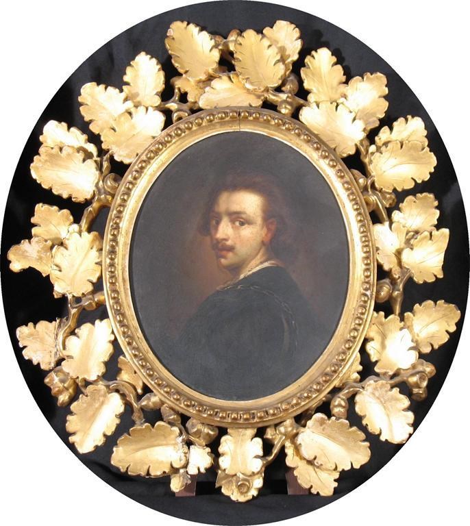 DUTCH SCHOOL (18th century): An oval portrait of a gentleman wearing a black jacket, oil on panel, 21 x 17cm (8.25 x 6.75in) in gilt oak leaf and acorn frame.