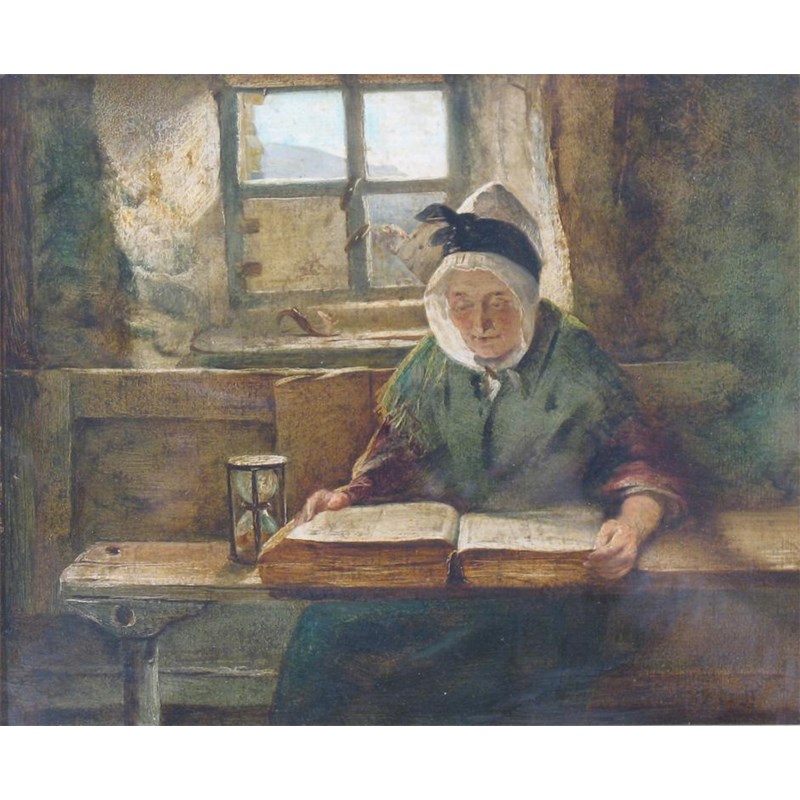 J. PHILLIP R.A. (19th century): An old lady reading a book by an open window