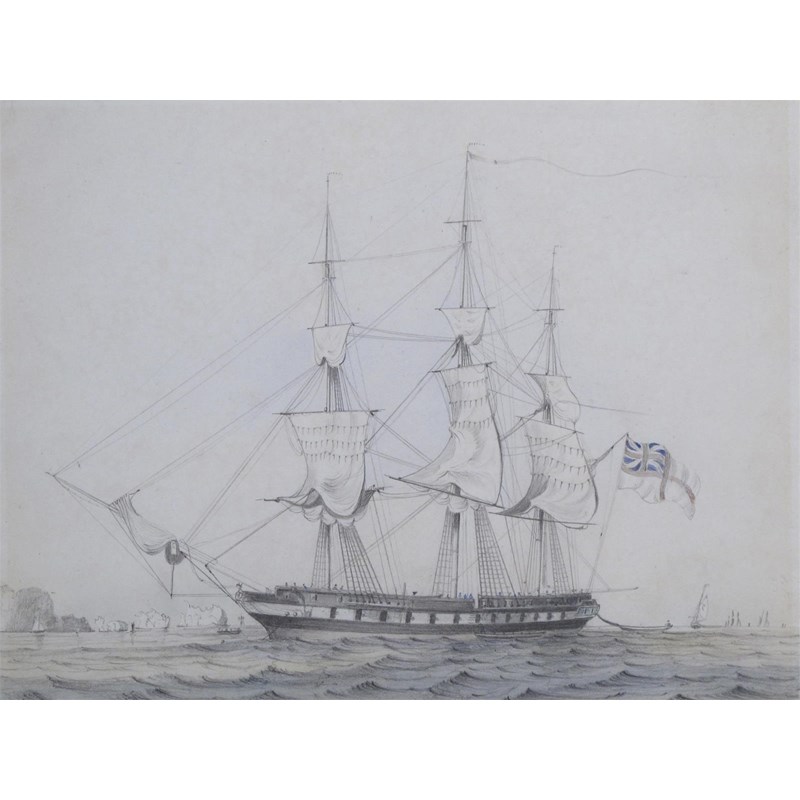 A frigate drying her sail at anchor near the Needles, Isle of Wight