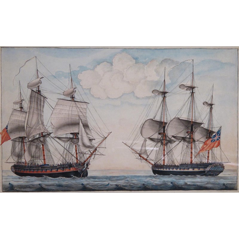 English School late 18th Century Two 38-gun frigates flying the red ensign Pen