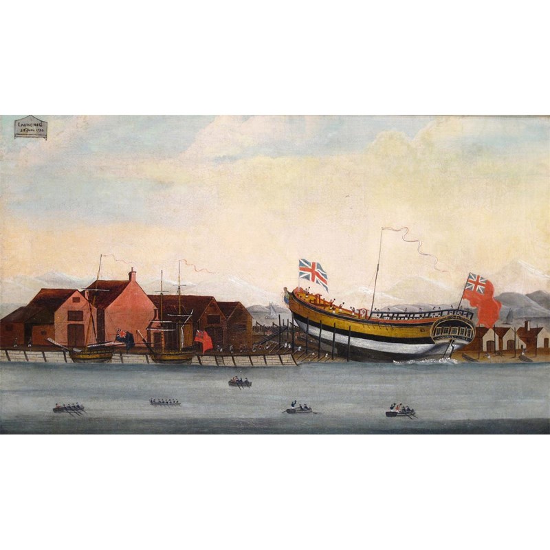 English School c.1795 The launch of the brig Abeona of Poole Bears inscription Launched 28th June...