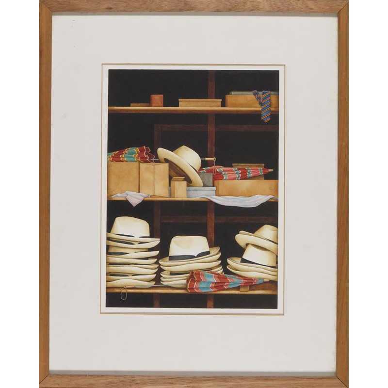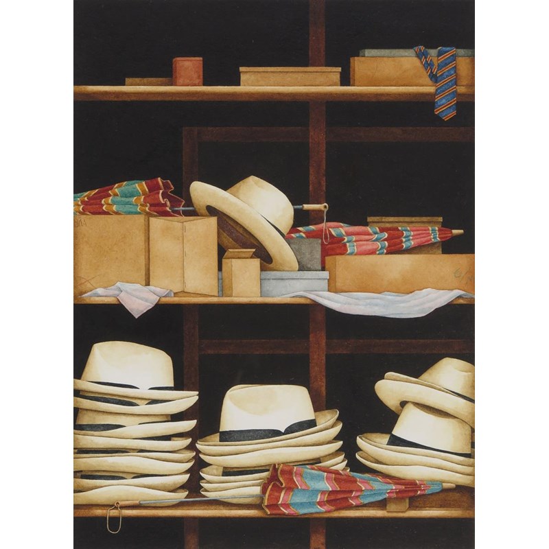 ‡Nigel Ashcroft (b.1951) Panama and parasols Signed with initials Watercolour 32 x 23cm