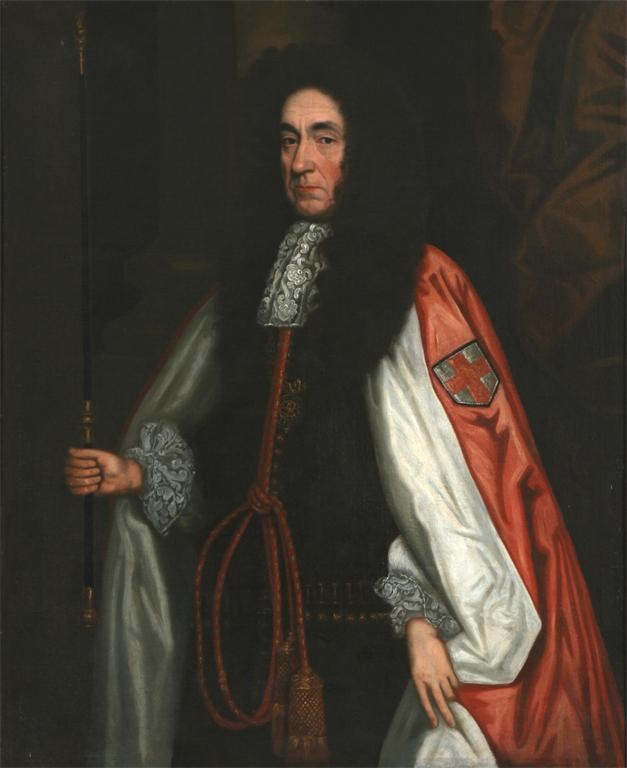 Circle of William Wissing Portrait of a gentleman, possibly Sir Thomas Duppa, Black Rod from 1683-1694 Half length wearing ceremonial robes and the Order of the Garter Oil on canvas, in a carved wood frame 127 x 102cm; 50 x 40in Little is known about the life of Sir Thomas Duppa, beyond his Parliamentary career. An engraved illustration, plate 17, from The Coronation of James II, depicts him in a procession and there is certainly a resemblance to the sitter in this portrait. The Black Rod he holds in the portrait is thought to have been retained by his descendents