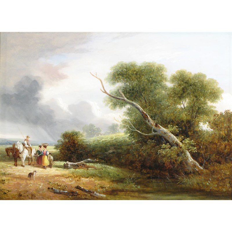 Travellers on a path in a wooded landscape