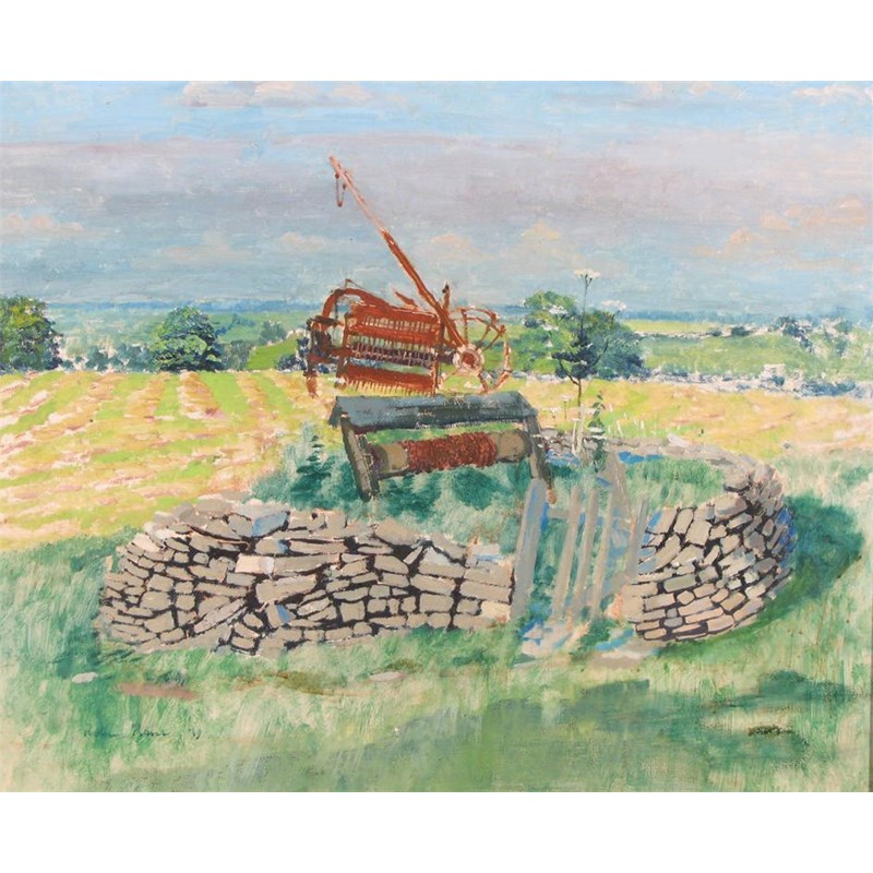 A hay rake and well in a landscape
