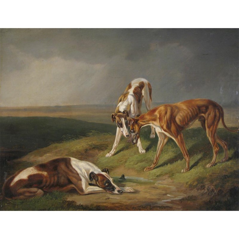 William Patrick Adam (19th Century) Three lurchers in a landscape Signed Oil on board 38 x 50cm;...