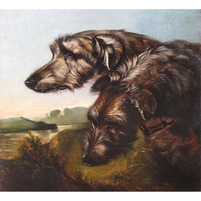English School mid 19th Century Two deerhounds in a lakeland landscape Oil on canvas 53 x 54cm;...