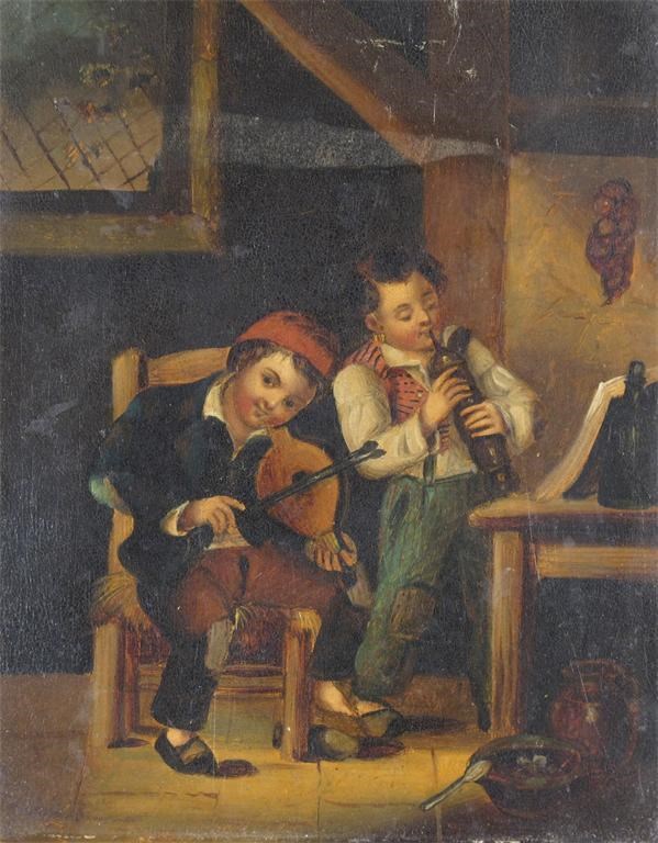 Dutch School 19th Century Interior scene with boys practising instruments Oil on metal 12 x...