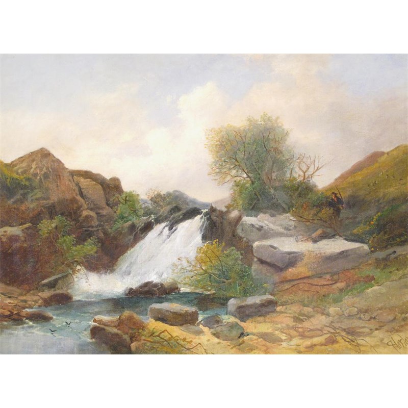 Joseph Horlor (1809-1887) A huntsman by a waterfall Signed Oil on canvas 41 x 56cm; 16 x 22in