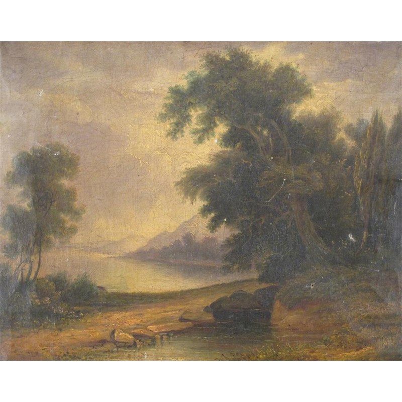 English School early 19th Century Lake landscape Oil on canvas 35 x 46cm; 13¾ x 18in