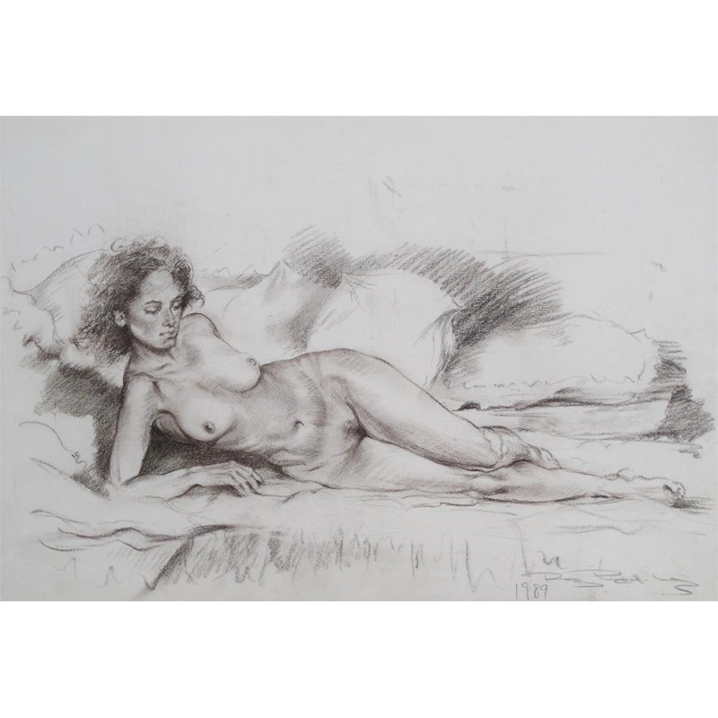 ‡Roy Petley (b.1950) Female nude reclining on a bed Signed and dated 1989 Black chalk 36 x 54cm;...