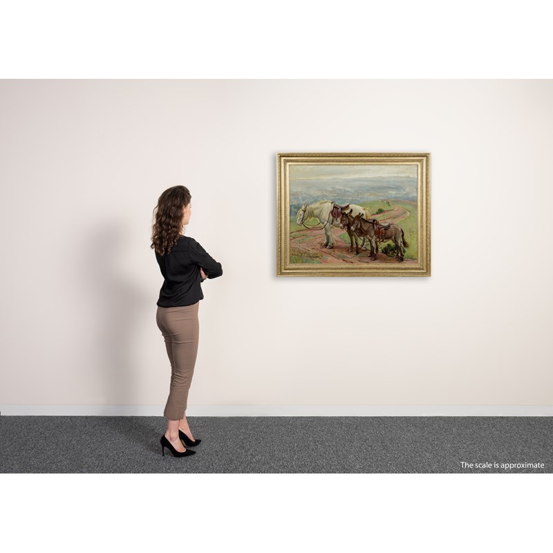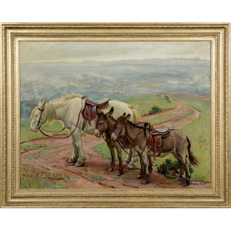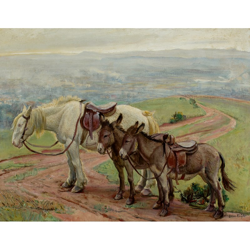 From 1929, Laura and Harold Knight enjoyed mingling with the artistic community in Malvern whilst staying at the Colwall Hotel. In addition to poets, musicians, writers and actors, Laura befriended Alice Betteridge. Alice allowed her pony, Kitty, and her donkeys to be available for pleasure rides during the Malvern Festival and this indulged Knight's fondness for the colourful and varied blend of characters in her pictures.