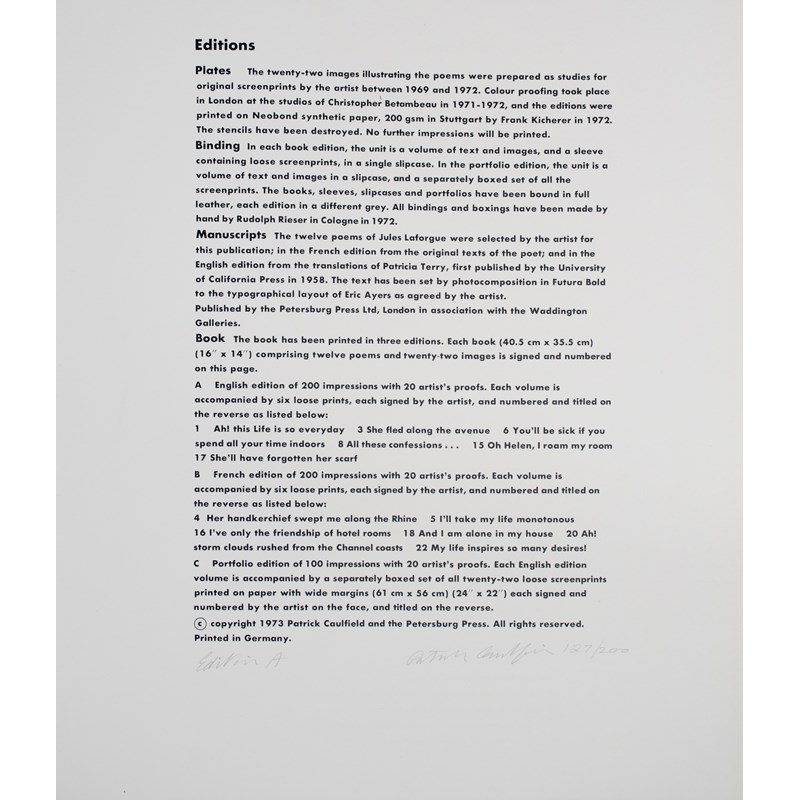Signed, numbered and inscribed in pencil Edition A Patrick Caulfield 127/200 on the justification, the accompanying prints each signed and numbered in pencil 127/200 Patrick Caulfield and stamped (some indistinctly) with title (to verso)