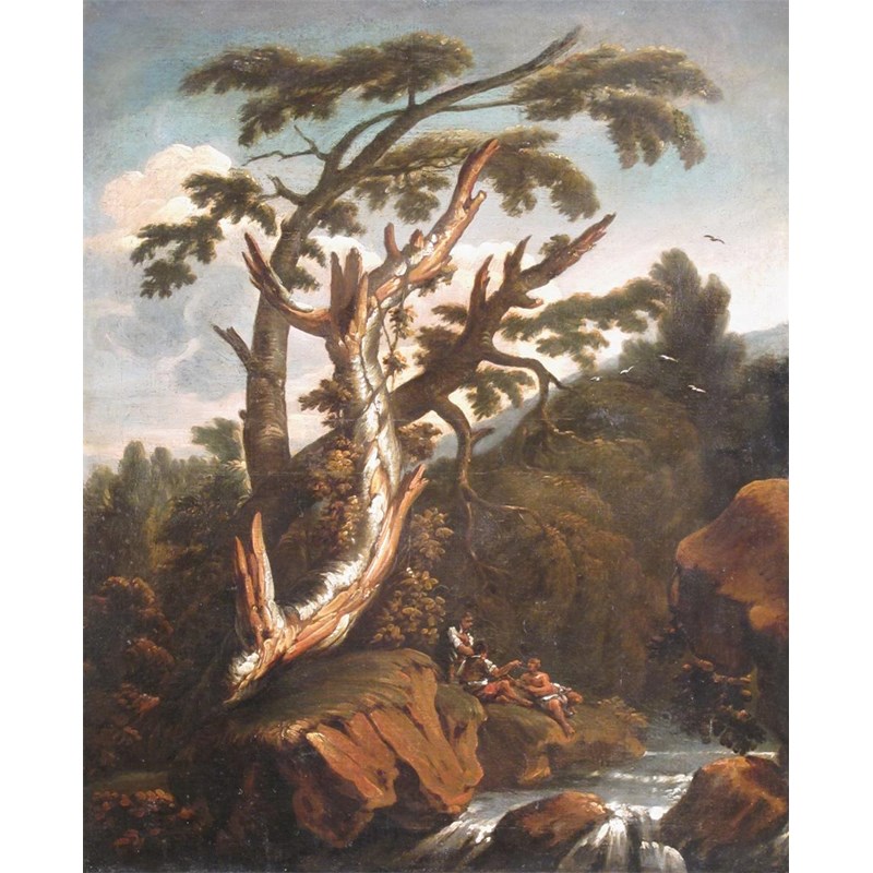 Follower of Salvatore Rosa A wooded river landscape with figures on a bank Oil on canvas 76.5 x...