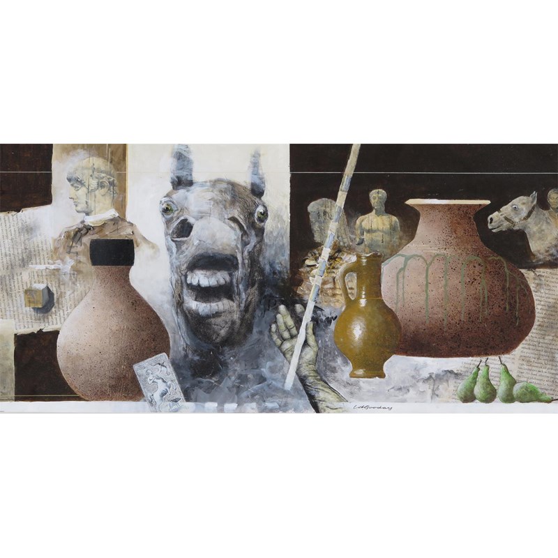 ‡Leslie Gooday OBE (1921-2013) War horse Signed Acrylic on board with collage 27.5 x 57.5cm...