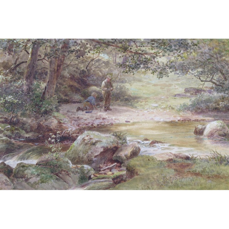 James George Bingley (c.1841-1920) Boys fishing by a stream Signed with initials Watercolour...