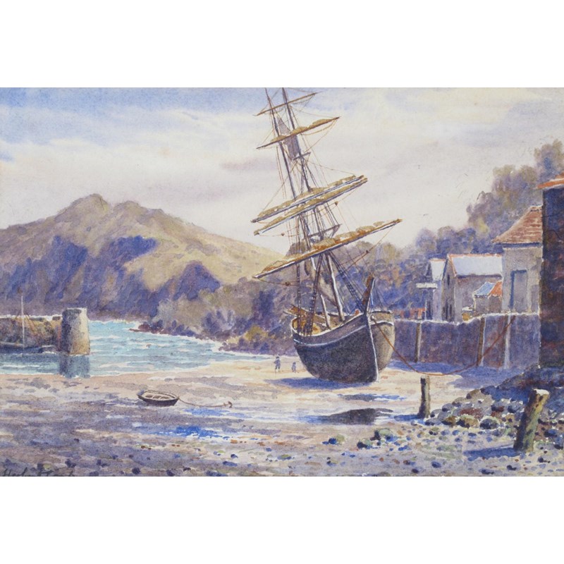 Hubert Coop (1872-1953) A boat in a harbour at low tide