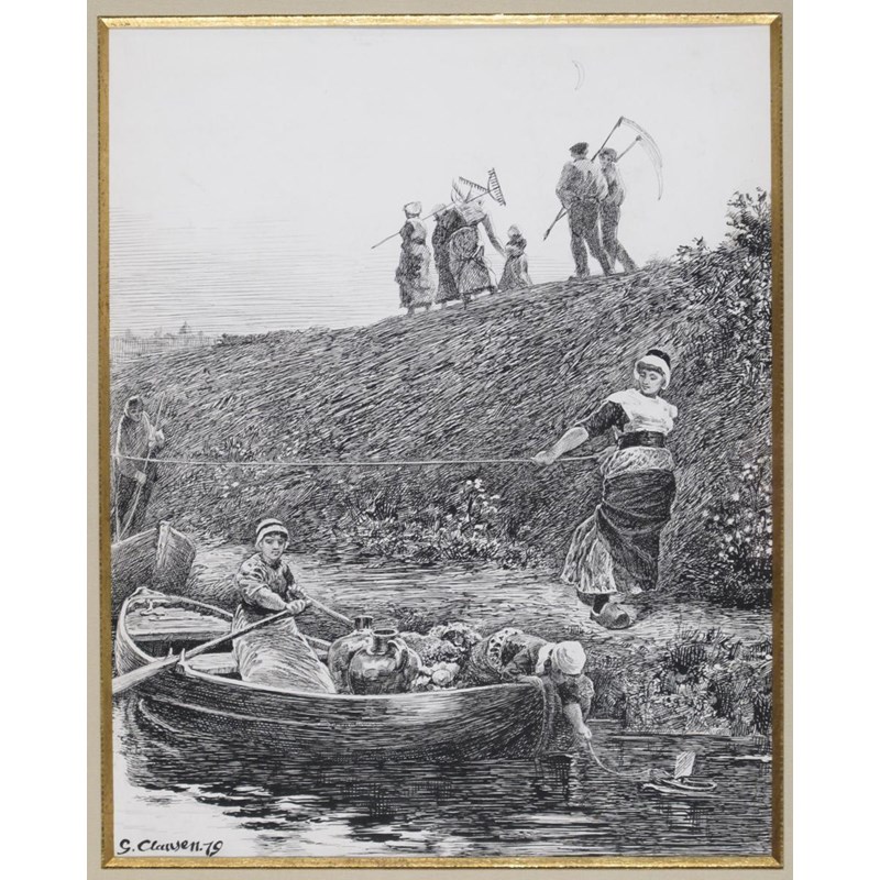 Sir George Clausen R.A. (1852-1944) The Ferry Signed and dated 79 Pen and ink 34.5 x 27.5cm;13¾ x...