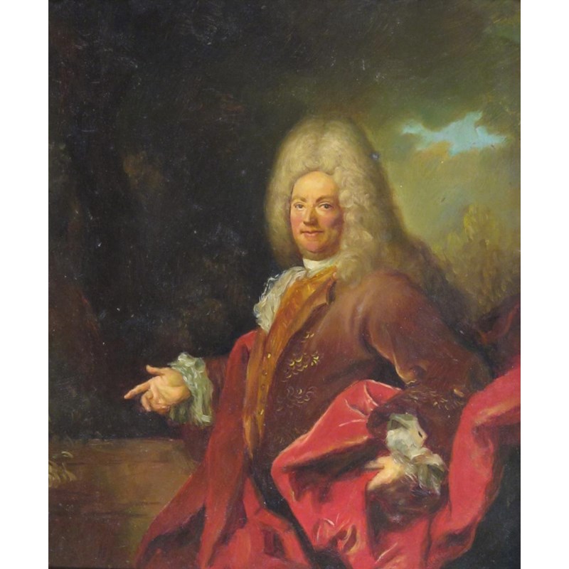 Manner of Hyacinthe Rigaud Portrait of a gentleman wearing a brown coat and red cloak Oil on...