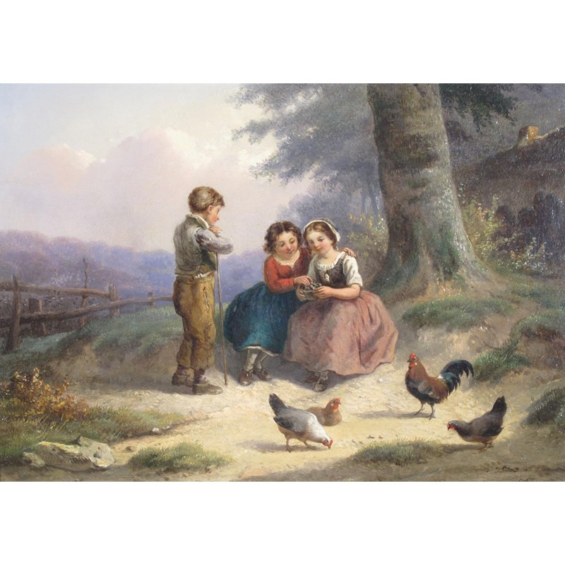 Robert Favelle (Dutch 19th Century) Children feeding the chickens Oil on panel 24 x 34.5cm; 9½ x...