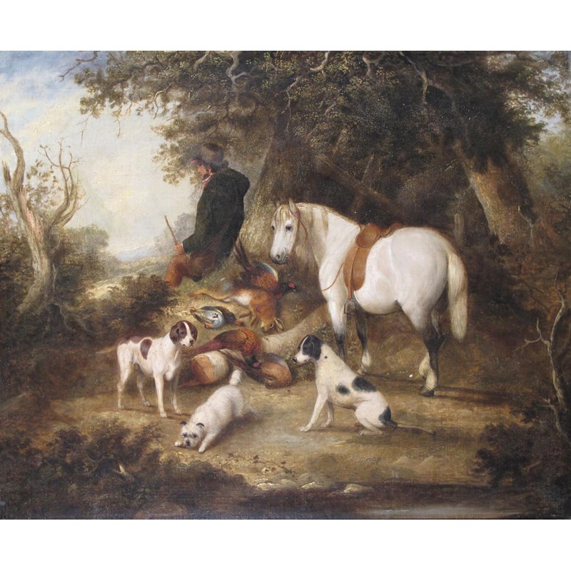 A huntsman resting with his pony, hounds and the day's bag at his side